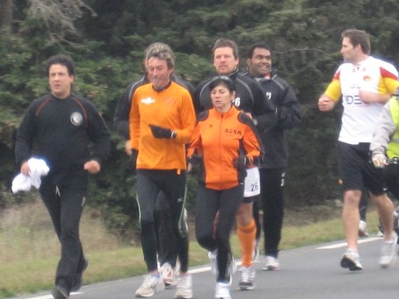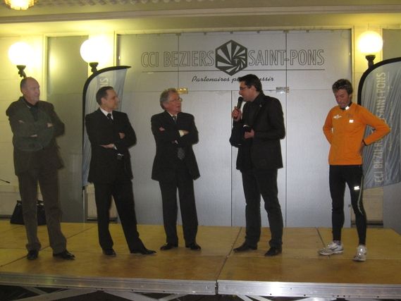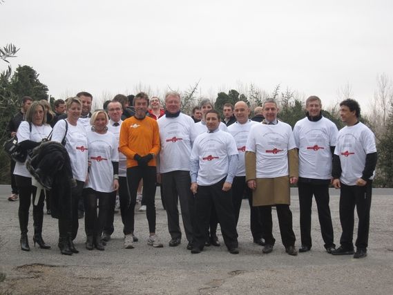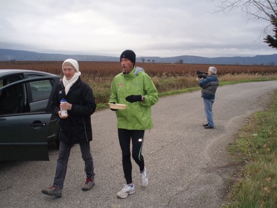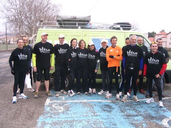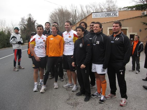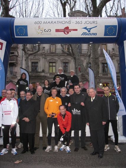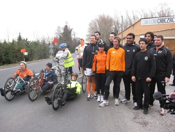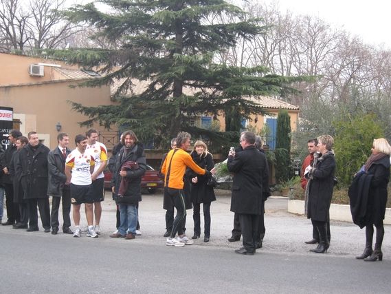 Cabezac is at km45 and we have our first appointment with Charles Reffay from the Union Financière de France office in Narbonne. He has organized a big group of colleagues and athletes: the Catalan Dragons (rugby a XIII, Super league), the USA Perpignan (rugbyXV, top 14), the RC Narbonne (rugby a XV, Pro D2), the ASC Narbonne (athletics) with Rosa Gangloff, French record holder for 10,000 meters, the Narbonne Volley Ball group, the Perpignan-Canet FC (soccer), the Sainte Rose Narbonne Golf Club. For the occasion, Serge wears black and orange in honor of the Racing Club. Serge takes the time to stop and shake hands with everyone and talk for a few moments before leaving in charming company, shoulder to shoulder with Rosa.