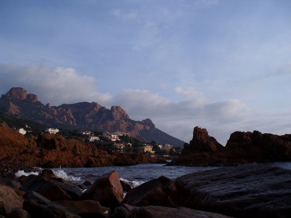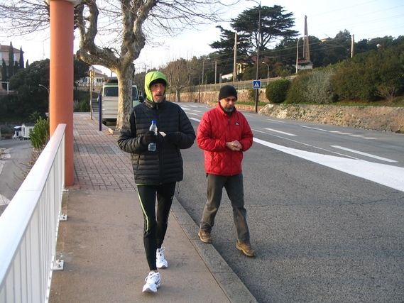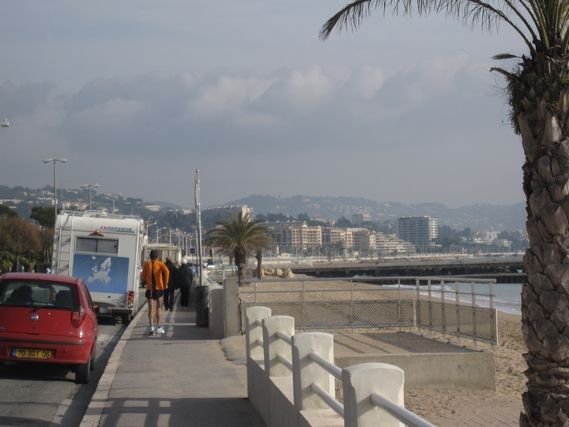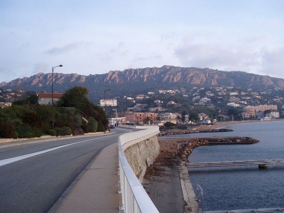 At the start this morning the sky is beautifully blue but there is an icy wind and Serge covers up, he who tends to run lightly dressed. The Esterel Mountain Mass by way of the corniche is splendid and its red rocks stand out against the sky and the darker blue of the sea. This is a maritime stage since we will follow the coast all the way to the Bay of Angels.