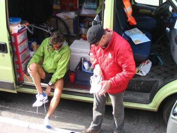 While I was doing my secretarial work this morning I had a phone call from Olivier, who heard about Serge’s course on the radio. He explained that last July 11 he left with his back pack to travel around the 27 countries of the European Union for a period of 3 years. He has only taken 21 days to rest and has covered 5,400 km, with stages of different lengths. He decided to leave with only his back pack and little money when he became unemployed. The hardships of life are often what trigger important decisions and the wealth of encounters on his route will be invaluable. Olivier is present when Serge arrives at the finish but because Serge is very busy they aren’t able to spend much time sharing experiences.