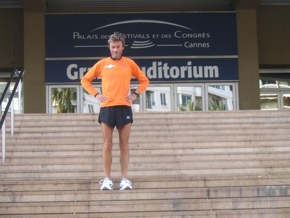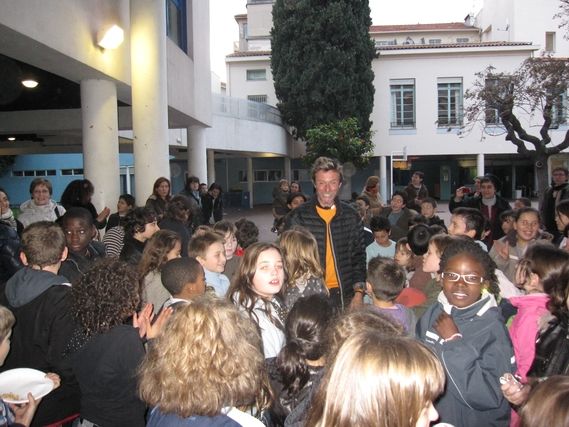 The arrival is organized by Joël of the Nice section of CJD, with children from the primary school of Baumettes in Nice singing songs, two steps from the Promenade. Then Serge answers questions from the enthusiastic group of children, who are very spontaneous: “do you get side aches?” now that’s a good question. He continues with the questions from 3 science students who are doing a project on “the limits of the human body,” then Serge talks with Jérôme and Jérôme who are working respectively on the development of the GPS beacon and with SportTK that sells it. It is already 6:30 and time to say goodbye. We say farewell to Olivier, frustrated not to be able to talk longer but as you may have noticed, Serge is feeling the effects of the race and as a matter of fact had a slight hypoglycemic attack at km60. It’s time for him to take his shower, eat and sleep because tomorrow there is a road to be run to reach Italy.