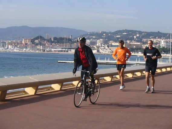 Gilles, a runner with an injury, accompanies Serge on his bike from the exit from Saint-Raphaël all the way to where Nice starts. The whole team thanks him for his help in going through Cannes and more importantly Antibes, where it isn’t easy to know which itinerary is best adapted to Serge and the team. Eliane gives him a kiss. Thanks, Gilles, and we hope we will meet you again. It was a day of many encounters: Emmanuel from Le Canet, Luc from Cannes, Fabrice from Mougins, Joël from Vence, Virginie, the secretary of the Antibes Athletic Club, Jean-Paul on rollers and lastly Pascal. There is also the visit of Olivier Le Creurer, editor for France 3 TV station for the PACA region (Province-Alpes-Côte d’Azur). He knows Serge for having been editor in Rouen. It’s nice on this day when France Television is on strike.