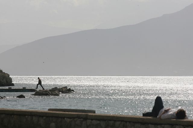 We find a place to stop on the parking lot of a « Taverna, » restaurant, after asking permission from a very kind elderly couple, who even gave us some oranges. We will go on a diet of oranges: they are marvelous and I know I have already mentioned that it’s amazing how much sweet juice comes from this citrus fruit when it is freshly picked. We see lots of orange groves as we reach the seaside.