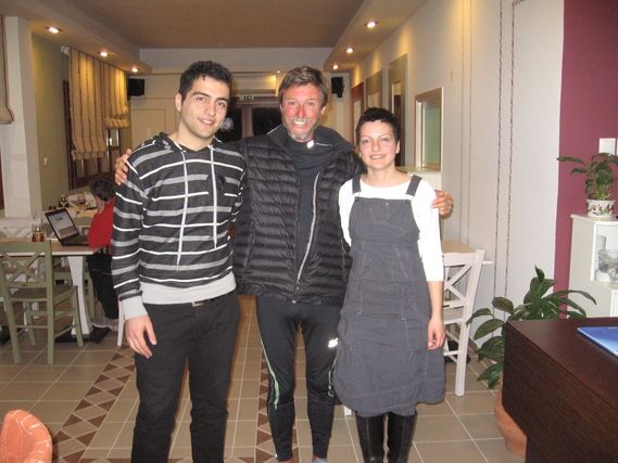 Tomorrow we end our stay in Greece, which has lasted three weeks, during which we have made some loops and detours. For the past 3 days I have had my nose glued to maps and guides and the Internet to learn about Bulgaria. This country is unknown to us and my curiosity is at its peak. I am eager to see what life is like for the Bulgarians and to learn their customs and habits, etc., etc. My only worry is the roads Serge will take, because there is not much choice, especially until we reach Sofia. Inevitably it is a truck route, but my motto is: Wait to worry! Serge has just finished another good day and he is happy, especially because we have found a hotel which is being renovated and so it is not officially open but they have accepted us. It is located near Lake Doirani and though the restaurant is closed our hosts, Olga, Giorgos and their parents are preparing grilled pork chops on the barbecue and homemade French fries, the traditional Greek salad and yogurt with honey, all delicious! Tonight we will celebrate our exit from this big hearted country, with smiling people who were happy to see us. Today two elderly men stopped to ask what were are doing. They wanted absolutely to speak German with us and had their picture taken with Serge.