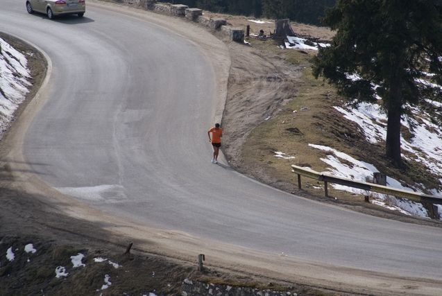 At km 25 Serge passes the town of Campulung. From here on it’s a “yoyo”, ascent, descent, ascent, descent but the yoyo never stops! There is still snow at the roadside, the towns are magnificent and the scenery glorious. We are in the Carpathian Mountains which run from Serbia to the Ukraine. We leave the plain and the region south of Wallachia to enter Transylvania. This region came within Romanian borders in 1918, following a turbulent history: Hungarian in the 9th century, then Turkish, then Austrian in the 17th century, then Hungarian again before returning to Romania in 1918. But during WWII Hungary annexed a part of this region before being chased out by the communists. If the world moves, so do borders and this region is populated by ethnic Romanians, Hungarians, Saxons (originally Germans) and Szeklers (of obscure origin). I give you all this information just to show that like Bulgaria, Romania and its borders come from a history of invasions and wars which have resulted in a great mix of populations. These people must sometimes find it hard to place themselves. This region, which are discovering at midday is gorgeous and today everyone seems to be at peace and enjoying the sunshine, while out for a stroll. Even Serge is strolling.