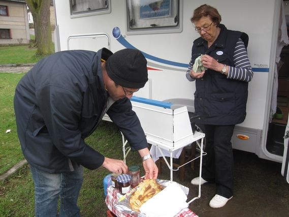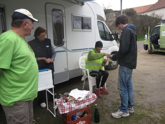Another foggy morning, the wind chills the air on the roadside and it’s not warm. Serge wears his jacket and cap all day. This Thursday, after being with us for a week, it’s departure time for our two carrier pigeons, who took the time to prepare a pancake party at km 20, in the village of Jasenice. It was an unusual picture of a caravan parked at the foot of the chapel, with Brigitte and her pancake pan in hand. Roger got out homemade cider, but watch out because tolerance zero is the rule for drinking and driving. It’s time for us to say goodbye and “see you soon” and it’s a moment full of emotion because each time they come their presence is a real breath of fresh air, to which is always added the ever-present smiles of Roger and Brigitte. It’s heart warming.