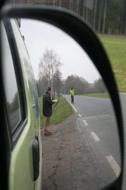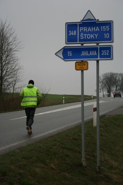 Serge seems to be in more pain today. The humidity is high, the head wind is terrible and the countryside is pale in the fog and mist this afternoon. Serge appears to be swinging his arms more than usual, which gives the impressing that it is helping to keep his body in motion. He walks as soon as there is a hill or an ascent even thought the road appears to be flat. What can be his next intermediary objective; perhaps the mileage at the half way point of the race in Prague on Saturday? What is he thinking about to pass time for all these kilometres? Today I will ask him that question.