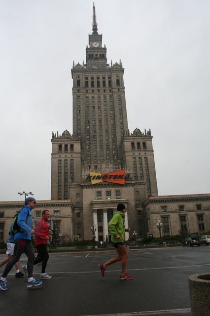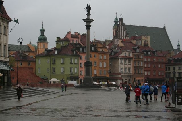 We are damp, even soaking wet, as we cross Warsaw. There is a stop at the Palace of Culture, the runners then pass the Charles de Gaulle intersection and on a street reserved for busses and taxis cross the heart of the old city all the way to the Royal Palace. Warsaw was destroyed during World War II and has been completely rebuilt. This makes it a “new” city, where some examples of communist architecture remain and find themselves next to the newest “Plexiglass” towers, as I call them, with their modern, streamlined look.