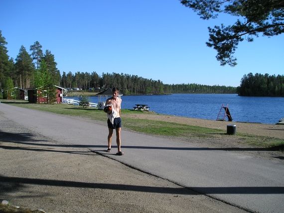 There is nothing special to tell. The sky is a beautiful blue and it’s a superb day. Serge has been applying sun block for the past 4 days and for 4 days he is twisted when he runs, like in Poland. If you ask him where it hurts, he says everywhere. And indeed that is the problem, general discomfort. There is no variety in the scenery; we are still lost in the midst of forests and occasionally come across a village at the edge of a lake.