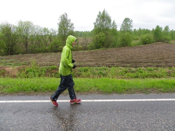 This time we have not escaped the rain, which has been falling all day. Serge looks like a little duck and as is always the case when it rains all day, our runner doesn’t mope but keeps his even disposition. It’s not a great day because he still has some physical problems: the dormant pain in the pubis and knee, which he treats by taking 2 Propofan (an analgesic). He tells me that most probably he will now have to live with the problem to the end of the race.