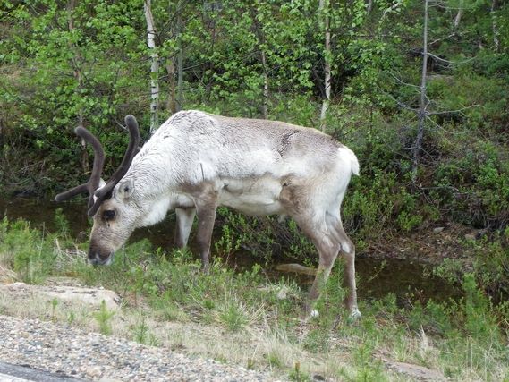 Now that we know how to tell an elk from a reindeer, we find we are seeing lots of them in the woods and along the road. Some of these deer live in captivity or on farms and others are at semi-liberty, but generally speaking they belong to someone who can be reimbursed if, for example, a vehicle kills one. You just have to go to the police with the number on the ear of the animal and its owner can be reimbursed for the loss. Reindeer is edible and the entire animal is of use to the Sami, for the fur and the antlers. It amuses Serge to observe them as he passes, when he doesn’t scare them off, because without being ferocious, they seem to keep a reasonable distance between themselves and human beings.