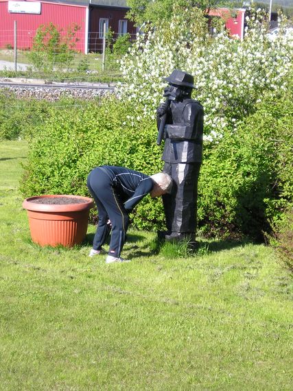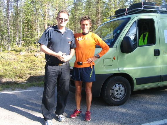 At the end of the stage in the region of Norbotten (the largest area in the country) on this small road with little traffic, a bus driver stops to greet Serge and the team, and then a truck driver stops near Eliane and René and gives them a cap. At the end of the morning we have a surprise visit from Pitea, a journalist, and lastly, at km 36, just as we enter the region of Västerbotten, Anette Novak, the editor of Norran, the most important daily paper of the region, arrives to see us. Anette speaks fluent French because she lived in Paris. More than just interviewing Serge during a halt, she ran 4 km with him and kept everything in her head that was said during their jogging, before flying to Stockholm.
