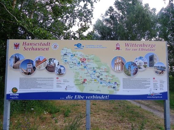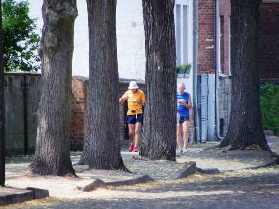 At 6H56 am Serge takes off « gently, » alternating walking and running, as is his habit. 9 km after departure, at Gartow, we see Laurent again on his bike. It is 32°C at 8H20. We had to find a bridge to cross the Elbe. We find it at Wittenberge, the city where once again the two front tires of the camping car are changed (sigh!!).