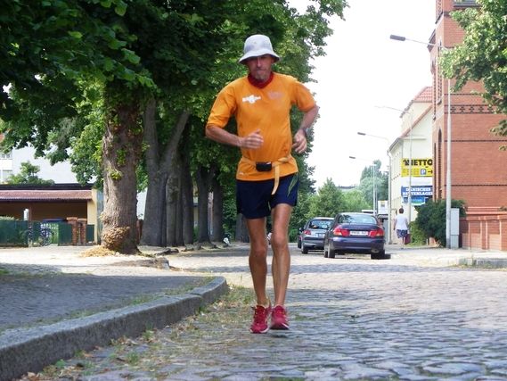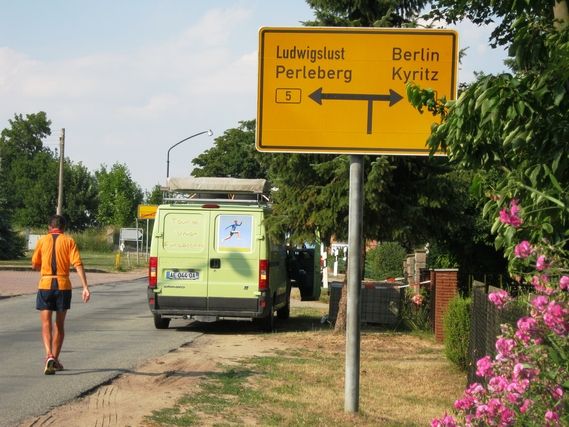 At km 71, Serge reaches the national route 5 and on this portion there is no cycle path. I suggest that he get into the vehicle so I can drop him 35 km further on to finish the stage at Gasthof, where we will spend the night. Serge finishes his day by running 3 km and tomorrow when he leaves he will be approximately 75 km from Hohen Neuendorf, where we will sleep tomorrow night. Peter has planned a well-filled day for Serge on July 16 and he must be in good shape, no super shape, to keep to the program.