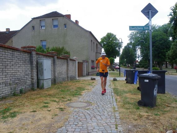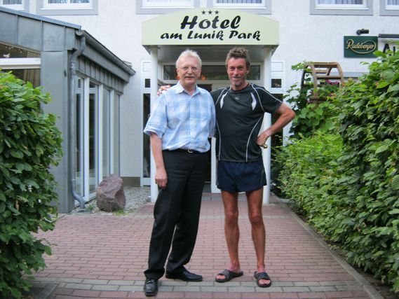 There are days when life is hectic on the Around the European Union Footrace. After calculating the arrival at Hohen Neuendorf (it’s well known that I’m not good with figures), we had to readjust our itinerary during the morning. There were still not enough kilometers so Serge finished his day in the parks of Hohen Neuendorf, guided by Peter Bartel on his bike, holding his French flag.