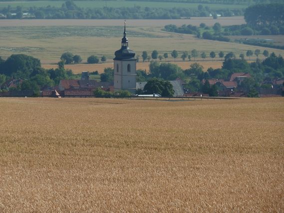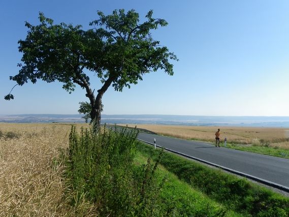 Serge did not appreciate his day, due to the return of hilly terrain, which is started when we arrived in the State of Thuringia, in the center of which is a mountain range that we will reach tomorrow. This state is known for its forests, but for the moment we are swimming in wheat. At one time all the highlands were probably covered with pines, then cleared to make room for intensive farming. I would not be surprised to learn that this place is the bread basket of Germany. There are 2 or 3 reapers working in a line and a cloud of dust rises from these huge machines.