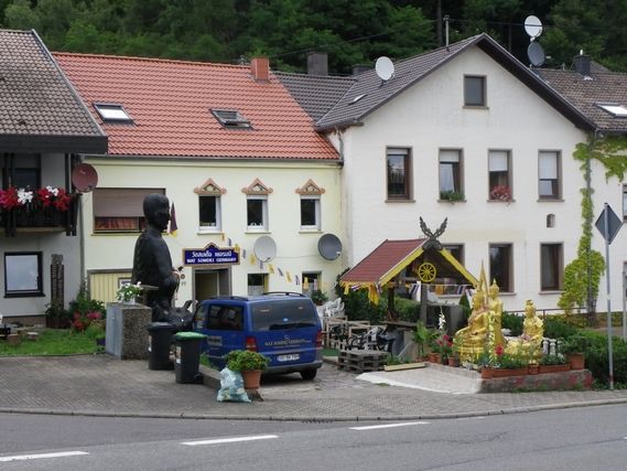 There is a string of villages, with bits of forest and valleys in between. The homes have nothing particular to point out in this province of Rhineland-Palatinate, or in the Sarre, which we reach at about km 15, except that the majority of the houses are painted white or off white. There are fewer farms, even thought there are some corn fields. The day before yesterday there were market garden crops on the edge of the Rhine, with immense fields of carrots and zucchini squash.