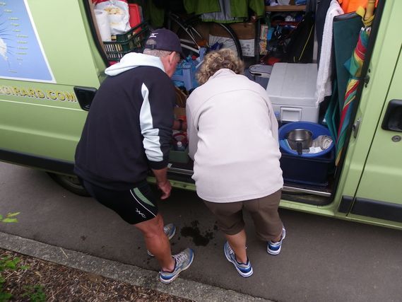 The 4 new arrivals came with our four  wheel drive (the one that went from Paris to Tokyo) which caused a lot of tongue wagging because Serge did not want a van and had eyes only  for the four wheel drive for this Around the European Union race.  So I have to say that he is delighted to see it but not as much as he is to see his son, Sébastien and Florian one of Seb’s  friends, and Brigitte and Jean-Yves, our neighbors and friends who are taking care of our house and our cat, Figaro.  Brigitte, whom some of you have already recognized, is the “Queen of Coconut baked custard” which Serge has already been able to eat during a refueling.