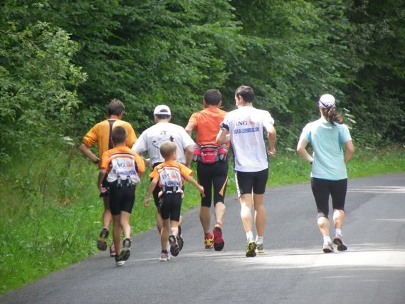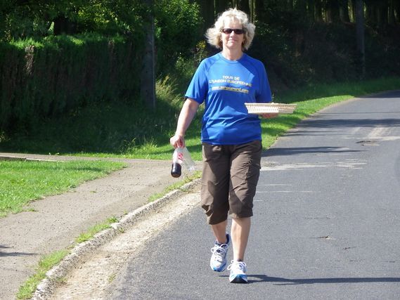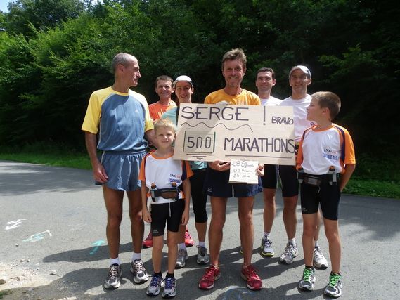 Today there were lots of encounters.  Nicolas, who called this morning, said he would come run a few kilometers.  Jean-Pierre returned as promised with his daughter, Stéphanie and his son, David, at 10:00 a.m.  Then this afternoon Michel and Claude joined the dream team and even Jean-Pierre’s grandchildren, Dorian and Jérôme were with us to celebrate the 500 marathons near Buzenol.  Thank you, Jean-Pierre, for giving us the detailed map of Belgium.