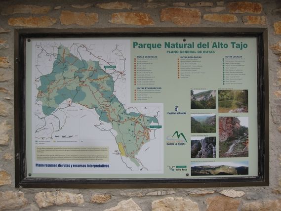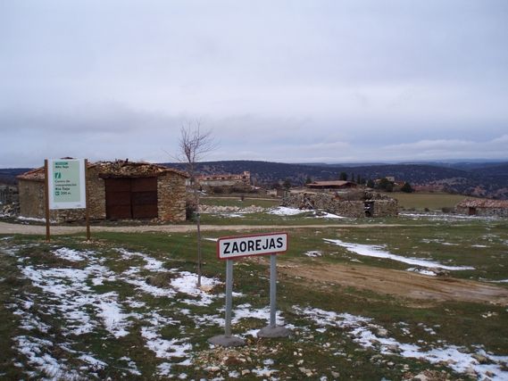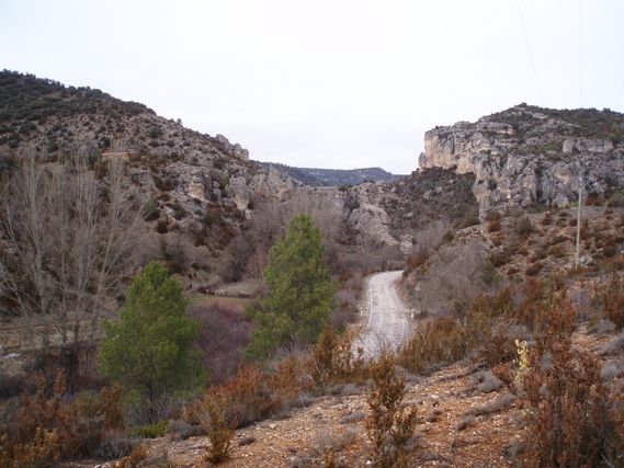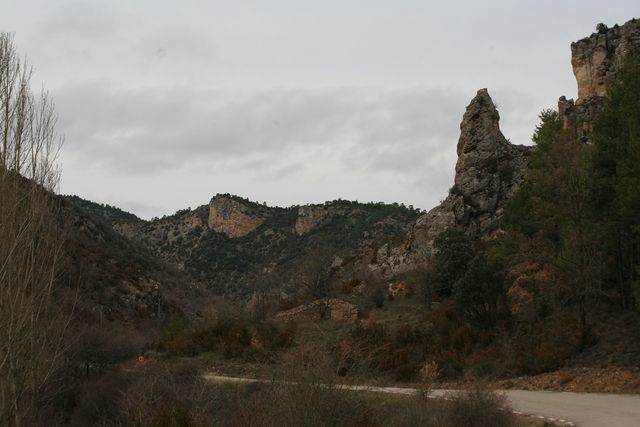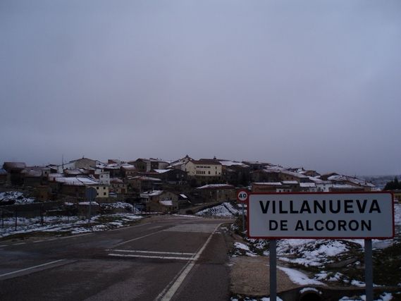 La route CM2015 que nous suivons depuis le 3ème kilomètre, est désertique. Brouillard puis grisaille, mais pas de pluie, et à partir de Villanueva de Alcoron, nous rentrons dans le parc naturel du « Alto Tajo », la neige sur les bas-côtés et le toit blanc des quelques maisons, nous laisse présager que plus que de l’eau, nous allons connaître la neige. Nous évoluons entre 800 et 1300m et continuerons à prendre de la hauteur en direction des Pyrénées.