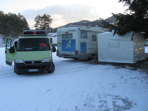 • Serge en fuseau, bonnet, coupe-vent, l’équipe qui sort les parapluies et la neige avec une première : la pause des chaînes sur le camping-car (mon tank aussi adoré que détesté) et un campement sur une fine couche de neige.