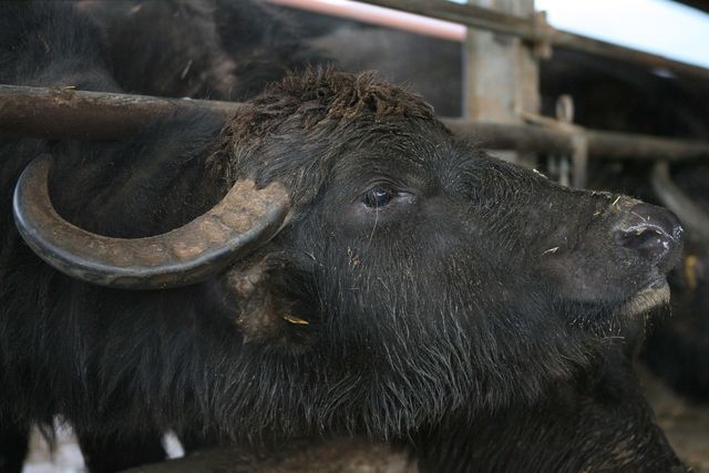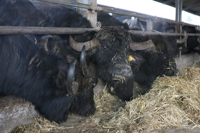Ce soir, Serge est grande forme autour d’une tablée bien achalandée : Prosciutto (jambon de pays) et Mozzarella di Buffala, sans compter les parts de quiche, de pizza, la salade de carottes et les épinards, puis vient la côte de buffle, les pâtes et la salade ; pour ma part, je n’ai déjà plus faim… mais les hommes mangent d’un bon appétit ce repas royal et frais que nous consommons directement chez le producteur. Nous aurons le loisir ce matin de visiter le laboratoire dans lequel est élaborée la Mozzarella, avec tout le processus de fabrication. Une petite visite dans l’étable des buffles s’impose, d’autant que Delphine, l’amie de Thomas, nous a fait part ce matin que le nouvel an chinois se préparait le 14 février prochain, l’année du Tigre remplaçant l’année du buffle. Elle a du avoir une prémonition de nous voir si proches de ces bovins, à la tête sympathique.