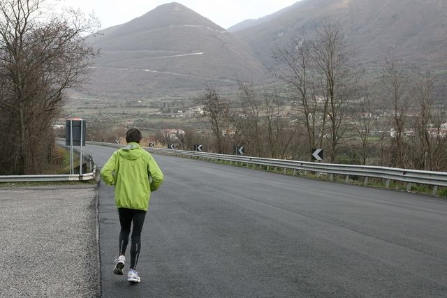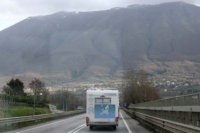Pendant ce temps-là, Serge, René et Daniel sont déjà partis, avec un retour sur la SS6. Serge va bon train et il est en pleine forme. Nous bifurquons après Vairano sur la S 372, route transversale empruntée par de nombreux camions, mais Serge bénéficie d’un petit bas-côté qui le sécurise et le détend. Telle une marionnette , il va passer son temps à lever le bras à chaque passage d’un poids lourd, tout content lorsque le chauffeur lui répond ou le klaxonne.