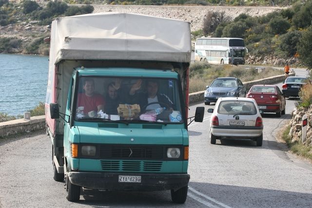 La journée du fourgon et de ses occupants, Daniel et Thomas, s’est bien déroulée. Une route simple jusqu’à Elefsina, puis quelques changements de directions pour retrouver la route de la zone industrielle, peu engageante. Le paysage fut varié, entre corniche au bord de mer, quelques traversées de villages, où Daniel et Thomas ont même acheté un demi poulet grillé, alléchés par l’odeur, et dans un autre domaine d’odeur moins agréable, quelques kilomètres au travers des raffineries de Agii Theodori et de l’entrée de Elefsina. Non, franchement, ça ne sent vraiment pas bon !