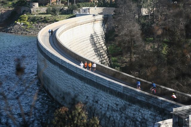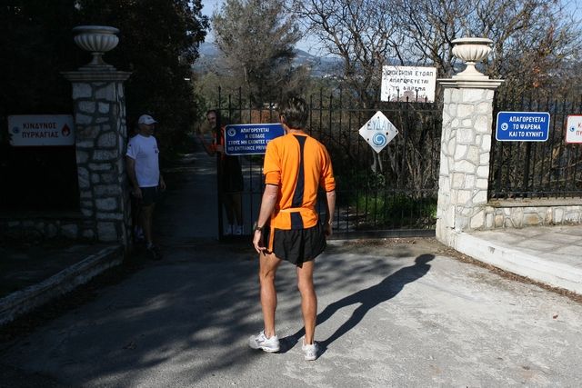 Pendant ce temps-là, Serge court, et il avance bon train, accompagné au départ par Alain qui nous sert de guide et c’est bien sympa. A noter qu’à Marathon, il existe le musée du marathon, mais qui n’ouvre ses portes qu’à 10H00, il sera donc trop tôt pour y jeter un œil. Puis Jean-Pascal, Christophe et Michel viennent agrandir le nombre, ils vont guider Serge par des chemins de traverse après le barrage du lac de Marathon ; de nôtre côté, nous faisons une boucle pour venir les attendre sur l’ancienne route nationale, qui reliait Athènes à Lamia, doublée par une belle autoroute que nous longerons, une route sans véritable charme, puisque les zones d’activités se succèdent, au loin quelques sommets enneigés et quelques villages paisibles.