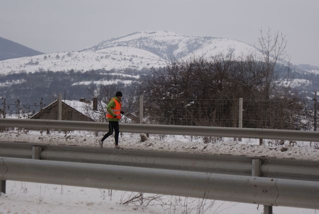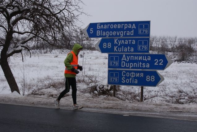 Un Serge, gelé. Il remet son blouson sous son coupe-vent, et dit ne faire aucun pronostic sur son temps de course. Au 9ème kilomètre, Serge me dit « Je ne sais pas ce que je serai capable de faire aujourd’hui »…Les jours passent et le genou gauche est de plus en plus douloureux. La route, même si nous le savions, n’a rien d’un plaisir, surtout dans la montée du col qui surplombe Pernik sur la droite, ville industrielle avec barres d’immeubles et cheminées d’usines…