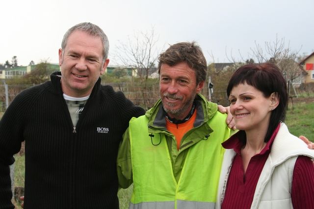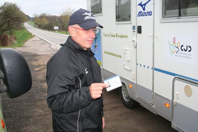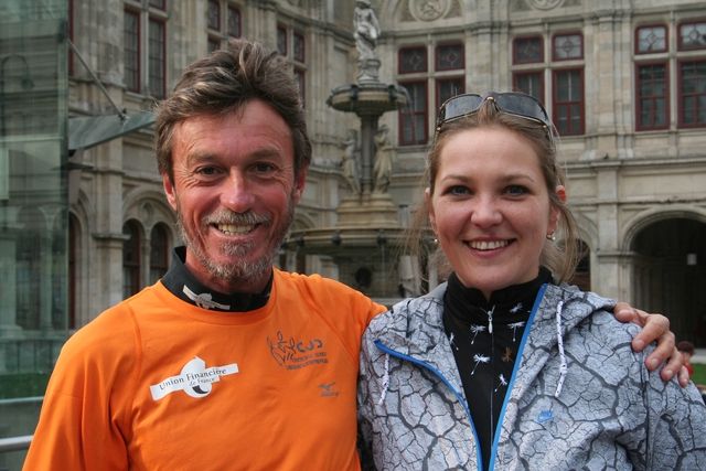 Les rencontres furent aussi inattendues que sympathiques : Josef et Bianka, suivent Serge depuis 2003, l’Afrique, ils habitent dans le secteur, et sont venus encourager Serge en nous apportant  4 bouteilles de vin, (notre collection augmente !), Helga,qui nous a passé un mail hier et nous retrouve à l’Opéra, elle viendra peut-être courir avec Serge demain, et puis des vacanciers français se sont arrêtés, entendant l’équipe parlant français, et voilà Serge qui signe des autographes.