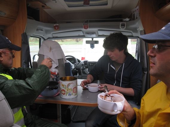 Marc, le cadreur, est reparti. La route continue au nombre de 7 personnes et 3 véhicules car Adrienne est toujours là, Brigitte et Roger faisant partie de la caravane. Tout le monde va bien, on garde ou essayons de garder le sourire malgré la pluie incessante a