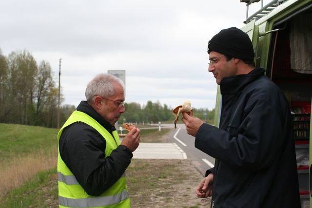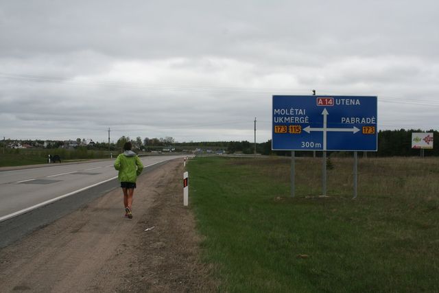 Depuis notre passage dans les Sudètes, entre la République Tchèque et la Pologne, le profil est plat. La Lituanie est une vaste plaine qui ondule, le point culminant du pays affiche 294m d’altitude. Nous suivons aujourd’hui, un seul et même ruban d’asphalte, la nationale A14. Elle offre à Serge de longues lignes droites et un large bas-côté sans trop de dévers, soit un confort de course non négligeable. Pour nous, c’est monotone d’autant que sur la totalité de l’étape, nous ne traverserons aucun village, nous frôlerons juste Moletai au 46ème km. Cela nous laisse du temps pour regarder les cartes et nous projeter jusqu’au cercle polaire. J’en frisonne d’avance d’autant que le mercure du thermomètre a des difficultés à dépasser les 7-8°C dehors et 10°C dans les véhicules. Cela n’empêche pas Serge de courir jambes nues, il porte tout de même, des gants et un bonnet.