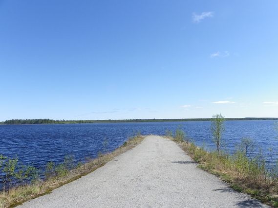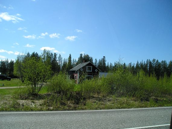 Grand beau soleil, ce matin, qui ne parvient pas malgré tout à réchauffer l’atmosphère rafraichie par un vent glacial, qui a tendance à vous geler le sang. 3,5°C, et Serge part couvert, avec blouson et bonnet, pour une nouvelle journée. La nature est omniprésente, et même si depuis notre arrivée au pays des 1000 lacs, nous le constatons quotidiennement, c’est encore plus vrai en Laponie, où les villages sont très éloignés. Quelques maisons, toujours en bois, peut-être un peu plus rustiques et plus petites que dans le sud, jalonnent ponctuellement, les kilomètres qui défilent. Nous retrouvons l’omniprésence de l’eau, une fois passée la ville de Sodankylä, en remontant sur la rive droite de la rivière Kitinen. Cette rivière s’élargit par endroits, et donne l’impression d’être un lac, les rives sont marécageuses, la végétation nous apparaît moins haute, même si les bouleaux et les sapins restent un fil conducteur.