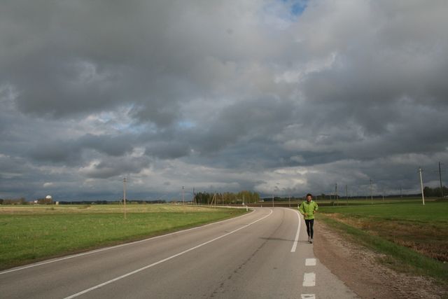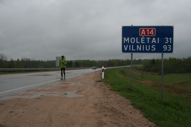 Même si au 6ème kilomètre, nous avons changé de N° route (118 contre A14), nous continuons tout droit. Voilà 160km de ligne droite ou presque, en tout cas sans bifurcation, jusqu’au 60ème kilomètre, à l’approche de Kupiskis.