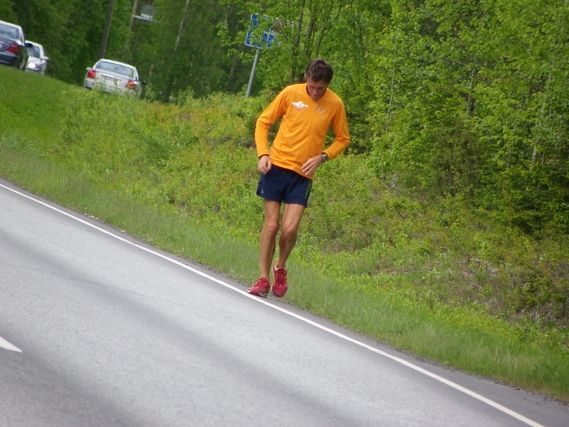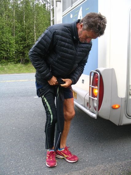 Serge a la tête des mauvais jours, il a mal au ventre et doit faire des arrêts fréquents pour soulager ses intestins qui le torturent. Après avoir cherché la cause de ce désagrément dans ce qu’il pouvait bien avoir mangé, nous penchons plus sur la possibilité d’un coup de froid. Hier, Serge n’a pas cessé de mettre et de retirer son coupe-vent, courant même avec des gants par moment. Ce matin, ravigoté par un rayon de soleil peu à même de réchauffer l’atmosphère, il enlève fuseau et coupe-vent dès le départ. Nous avons déjà pu constater que le fait d’avoir froid se reporte facilement sur les intestins de notre coureur qui semble avoir toujours chaud !!!! Il ne faut pas baisser sa vigilance mais Serge est relativement têtu et quand il a décidé de ne pas se couvrir, il faut abdiquer. Une longue et nébuleuse journée pour lui.