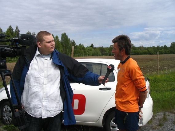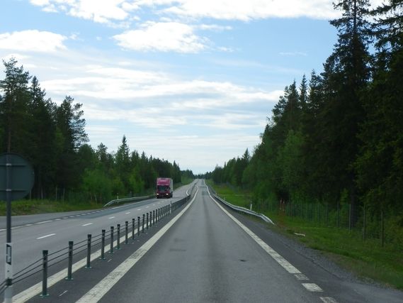 Avant Renea sur la E4, nous aurons la visite du journal de la région du Norbotten et de la télévision. Venus de Lulea, ils ont été avertis par Lennart de la présence de Serge dans le secteur. La route nationale, avec ses bas-côtés étroits et sa circulation, ne se prête guère à de longs discours. Cette route n’est décidément pas faite pour notre caravane, et c’est sans une once de regret que nous quittons les rails tracés de cette E4, où les kilomètres de grillage (utile pour éviter la présence des élans sur la route), nous donnent l’impression d’être en cage. Nous avons tous le même sentiment, les grands axes ne reflètent en rien l’âme du pays, dont vous ne voyez d’ailleurs rien. Un peu comme si un étranger visitait la France, en empruntant les autoroutes.