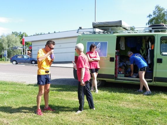 Lors d’une attente à un rond-point, nous apercevons un coureur qui accompagne Serge. Il s’agit de Victor, suédois de Stockholm, il parle la langue de Molière aussi bien que nous. Il a retrouvé Serge grâce à son I Phone et à la balise de géo-localisation, il ne nous avait pas avisés de sa venue, et ce fut une heureuse surprise. Serge va babiller un bon moment et même parler avec les mains (je me demande parfois s’il n’a pas des origines italiennes !)