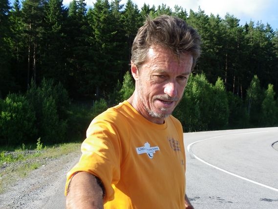 Serge tout rouge, dira « Je vais rentrer bronzé de mes vacances » et de rajouter « j’ai hâte d’être au Danemark, il paraît que c’est plat ». Serge est bavard à mon côté, pendant que j’écris ces lignes, alors qu’il était muet sur sa route, mais il se défoule et aime à plaisanter. Il me dira, si je pouvais courir allongé, je passerai plus d’heures sur la route.